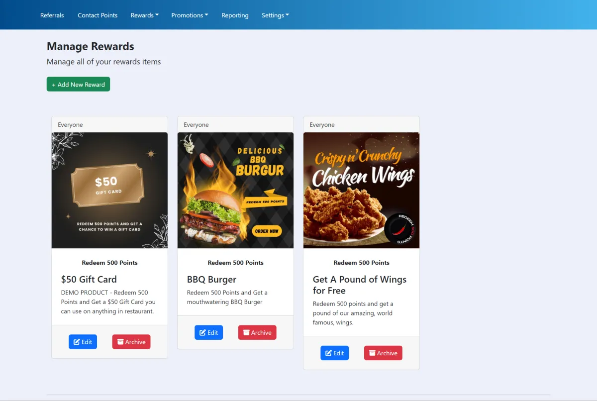 Add rewards, set points values for redemptions, and when your customer has enough points saved up they can redeem these rewards, and print off a voucher they can bring in to receive their item.